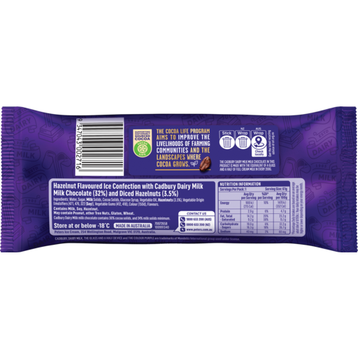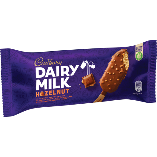 Hazelnut flavour surrounded by Cadbury Dairy Milk Milk Chocolate and crunchy diced hazelnuts. It's deliciously smooth and creamy.
