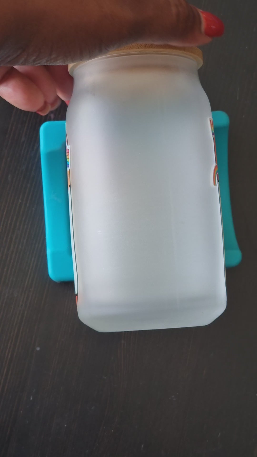 Impression multicolore avec effet gaufré sur une tasse en verre transparent de 16 oz avec couvercle en bambou et paille en verre