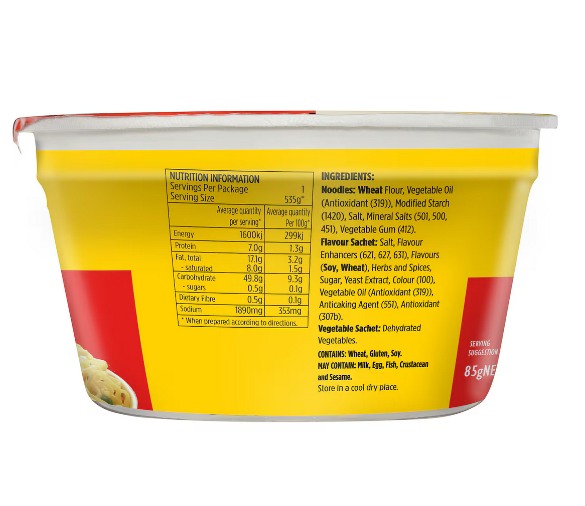 Noodles: Wheat Flour, Vegetable Oil (Antioxidant (319)), Modified Starch (1420), Salt, Mineral Salts (501, 500, 451), Vegetable Gum (412).Flavour Sachet: Salt, Flavour Enhancers (621, 627, 631), Flavours (Soy, Wheat), Herbs and Spices, Sugar, Yeast Extract, Colour (100), Vegetable Oil (Antioxidant (319)), Anticaking Agent (551), Antioxidant (307b).Vegetable Sachet: Dehydrated Vegetables.
