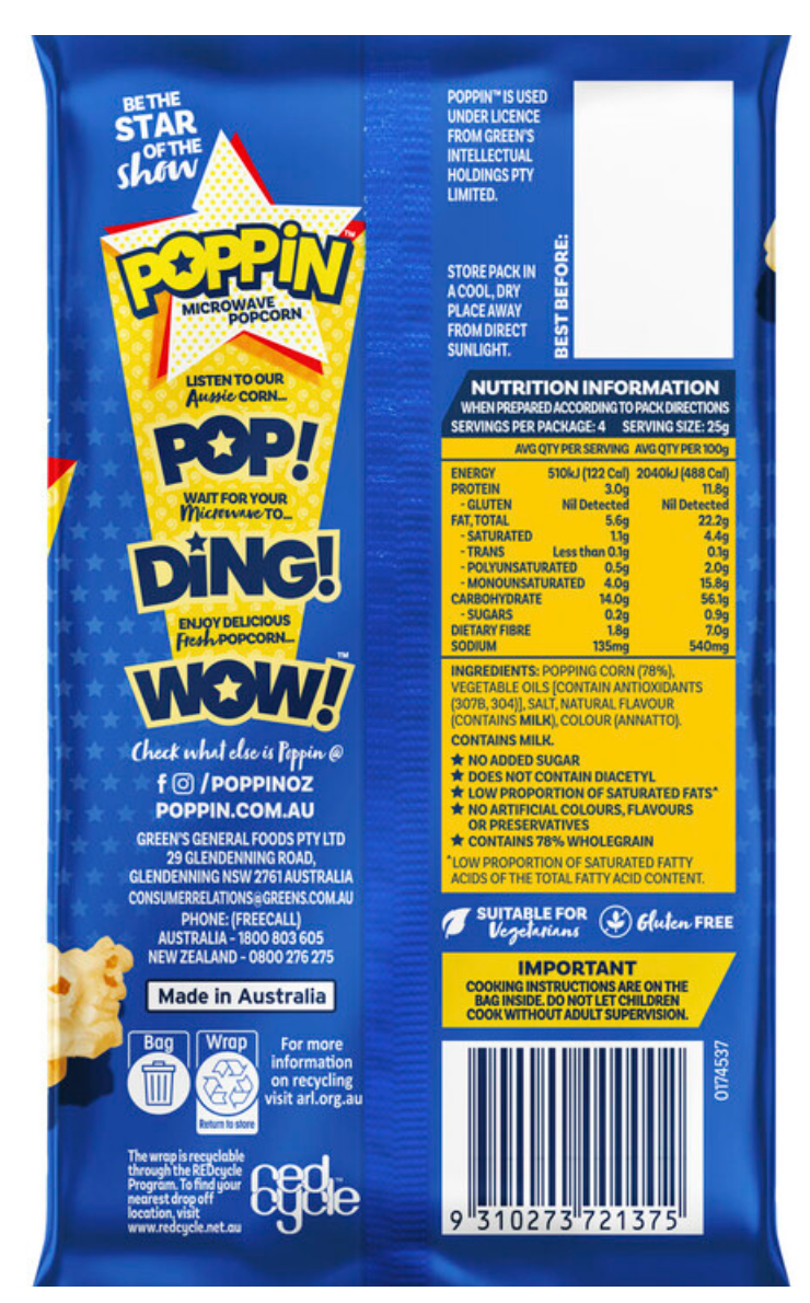 Popping corn (78%), Vegetable Oils (Contain Antioxidants (370b from Soy, 304)), Salt, Natural Flavour (Contains Milk), Color (Annatto).