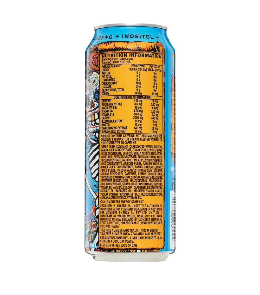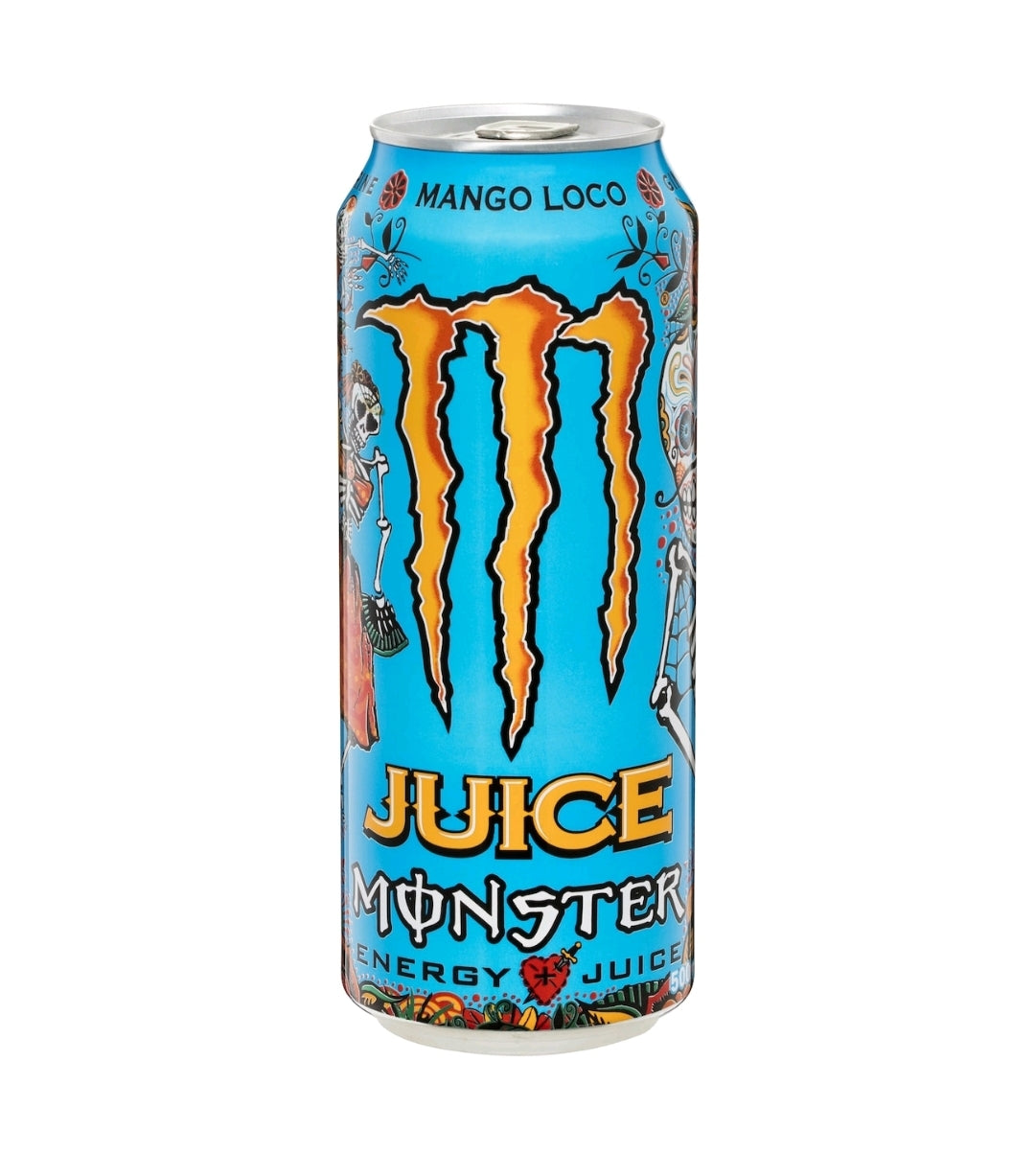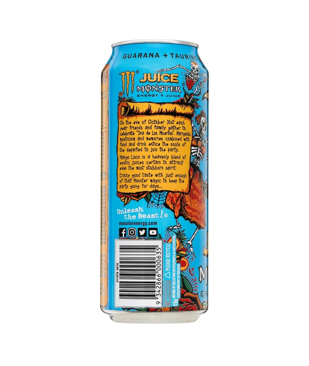 Monster Energy + Juice Mango Loco contains guarana, taurine, ginseng & inositol. On the eve of October 31st each year friends and family gather to celebrate "Dia de Los Muertos". Marigolds, mysticism and memories combine with food and drink entice the souls of the departed to join the party. Mango Loco is a heavenly blend of exotic juices certain to attract even the most stubborn spirit. Crazy good taste with just enough of that Monster magic to keep the party going for days.. Unleash the Beast! Energy + juice.