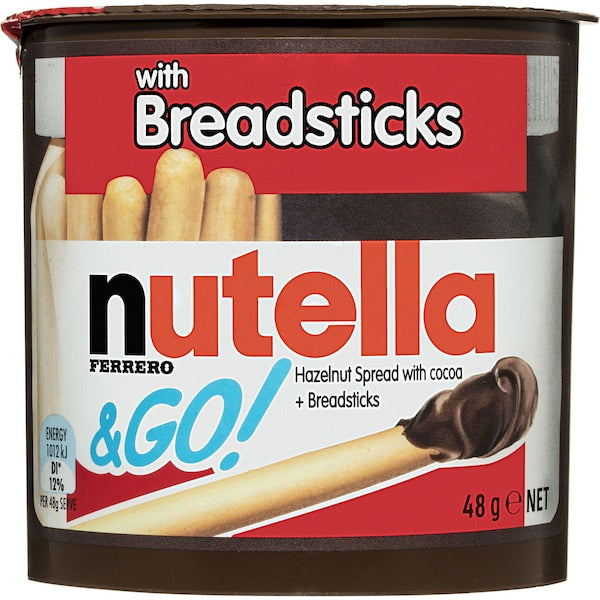 - Nutella & Go! Is the convenient snack ideal for the on the go break. Its unique snack pack has two sections: one filled with crunchy breadsticks and one filled with delicious NUTELLA® hazelnut chocolate spread.