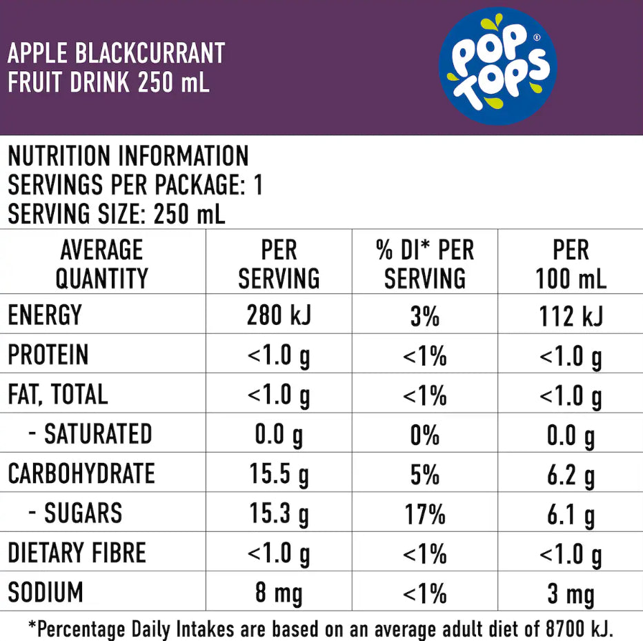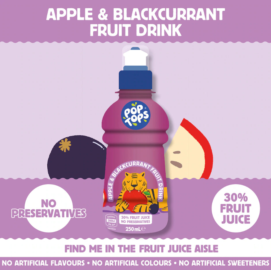 Pop Tops Fruit Drink Apple Blackcurrant contains 30% fruit juice with no preservatives, no artificial colours, flavours and sweeteners.